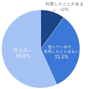ペットを写真で残す人が多いなか、「写真館やスタジオでのペット撮影を知っているか?または利用したことはあるか?」聞いたところ、「利用したことがある」と答えた人はわずか10%にとどまり、「知らない」56.8%、「知っているが、利用したことはない」33.3%という結果となりました。