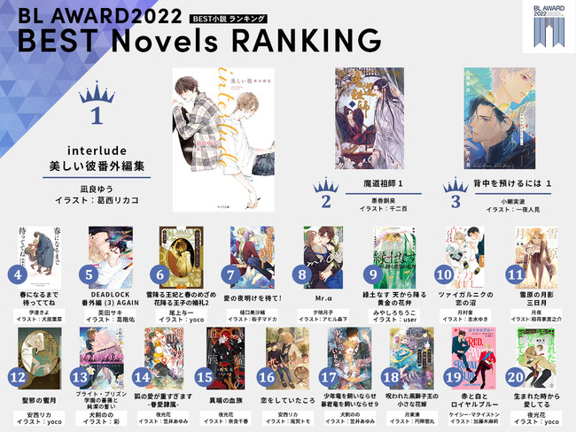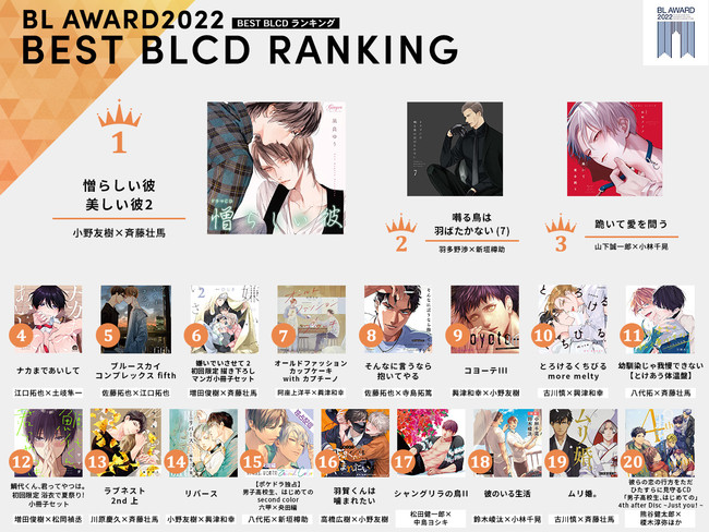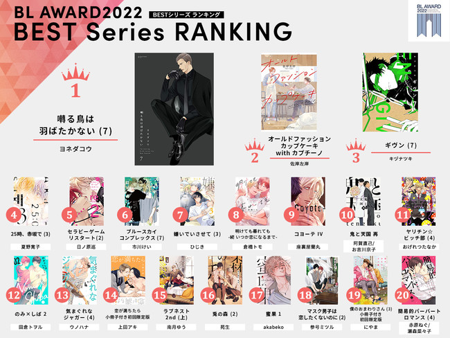 「BLアワード」とは、発表前年に発売された商業BL作品の中から、最も輝いていたBLの最高峰をファンの投票によって決定するランキング。2009年より開始し、今回の「BLアワード2022」で13回目を迎えます。