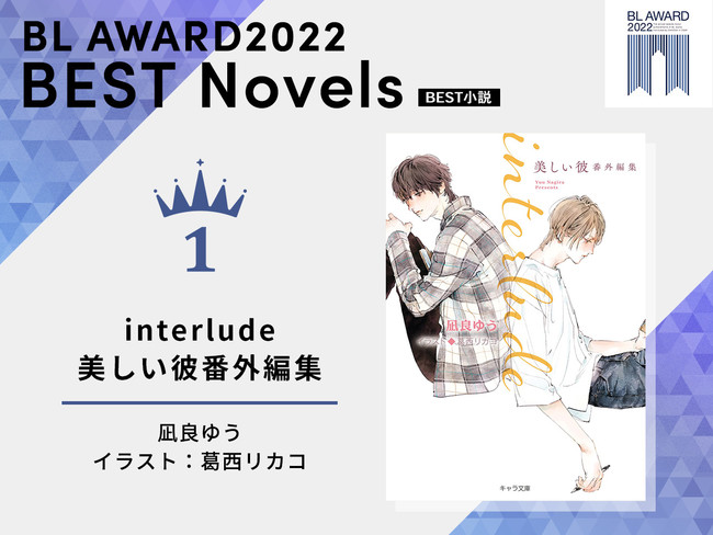 昨年新設されたBEST映像部門では、TVドラマ『美しい彼』が堂々の第一位。原作小説の世界観を見事に表現した演出やキャストに、国内外から絶賛の声が続出しました。小説部門では番外編『interlude 美しい彼番外編集』が、BLCD部門では『憎らしい彼 美しい彼2』がそれぞれ1位を獲得。さらにメインキャラがそれぞれ受部門・攻部門でトップに立つなど、まさに2021年のBL界を席巻した作品に。