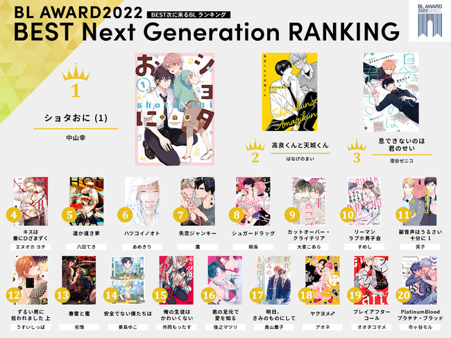 一方で興味深いのは、新進気鋭の作家たちが名を連ねる次に来るBL部門。1位に輝いたのは『ショタおに(1)』(中山幸)。BESTコミック部門とは雰囲気の違う、ほのぼのとした日常を描いた作品がランクインしました。