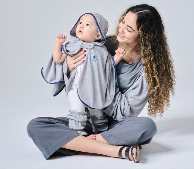 パイル素材を使った大人用5WAYUVカットボレロと、同素材の赤ちゃん用ケープ&レックガード