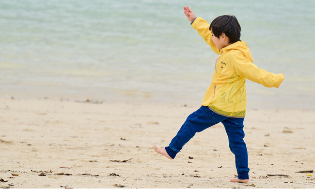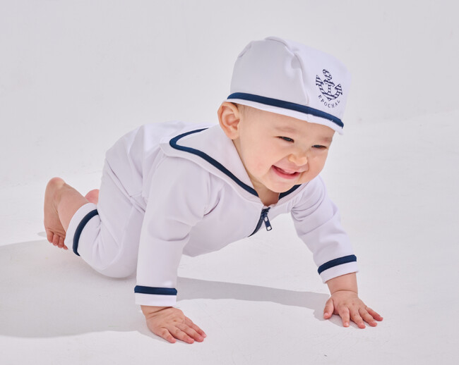 マリンスタイルのカバーオールタイプは、脱着も楽であると同時に、身長90cmの時には長丈タイプで着用し、歩き始めて水遊びを楽しめるようになる100cm頃には、動きやすい七分丈で着用できる。0歳から3歳くらいまで使えるコスパの良さで、出産祝いなどでも人気の製品。