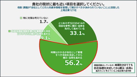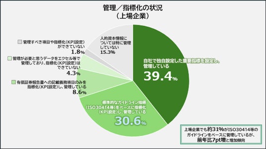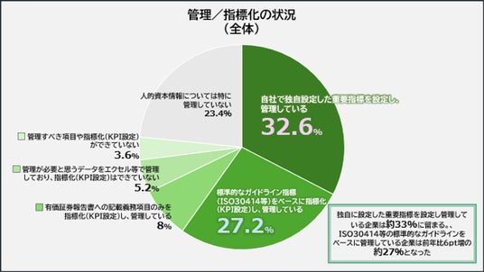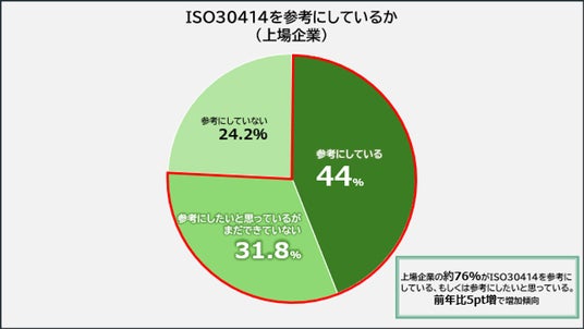 独自に重要指標を設定・管理できている企業は約33%(同+3pt) に留まる。一方でISO30414等のガイドラインを参考にする企業が約27%(同+6pt)、上場企業でも約31%(同+7pt)と増加傾向。また、ISO30414については、「参考にしている」または「参考にしたい」と回答している上場企業は約76%(前年比5pt増)で、依然信頼が厚い。