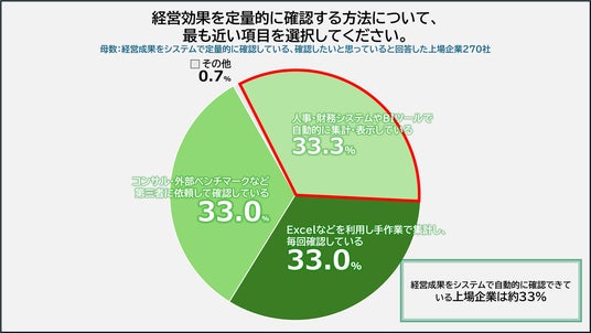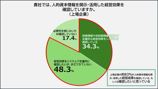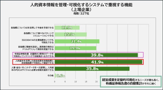 上場企業の約83%が、人的資本を活用した成果を定量的に把握したいと考えている。しかし、システムで自動的に把握できている企業は約33%に留まる。また上場企業が人的資本を管理・可視化システムで最も重視する機能は「経営成果を財務・非財務情報で可視化できる仕組み」(約42%)となり「経営貢献の可視化」のニーズが高い。