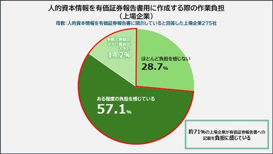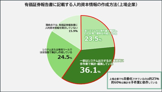 有価証券報告書への記載について、上場企業の約60%が何らかの手作業で対応。義務化項目を自動的に集計できている企業は約25%に留まる。記載している上場企業の約71%がその集計作業に「負担に感じている」と回答。