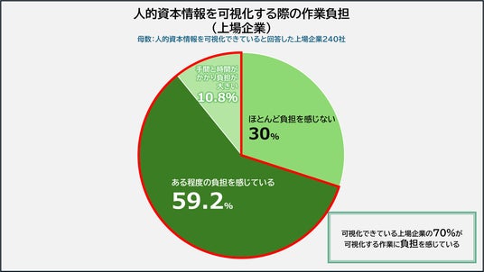 人的資本の「可視化」は着実に進展しており、上場企業においては73%(昨年比+2pt)が実現しています。一方、その実行プロセスには依然として大きなハードルが残ります。可視化できている上場企業のうち70%が「作業に手間がかかっている」と回答しており、多くの企業でデータ収集・統合・加工といった実務が大きな負担となっている実態が明らかになりました。これは、データを活用した戦略的人事施策に踏み出すうえで、前提となる準備作業がボトルネックになっている実態を示唆しています。