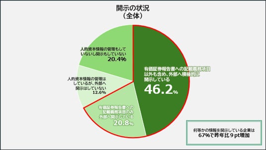 全体的に開示は進み企業全体でも昨年比9pt 増の67%が開示、上場企業では7pt 増の85%が開示と着実に進んでいる。有価証券報告書義務化項目以外も開示している企業も約46%に拡大(昨年比+9 ポイント)。