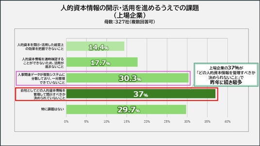 続いて2番目に多かった課題も昨年に続き2位の「人事関連データが複数システムに分散しており一元管理ができないこと」。上場企業では約30%が挙げている。