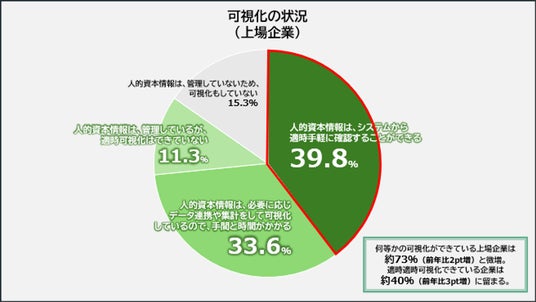 「可視化」については、上場企業においては約約73%(昨年比+2pt)が何らかの可視化を実現。適時可視化できている上場企業は約40%。その可視化できている上場企業の70%が「作業に手間がかかっている」と回答。