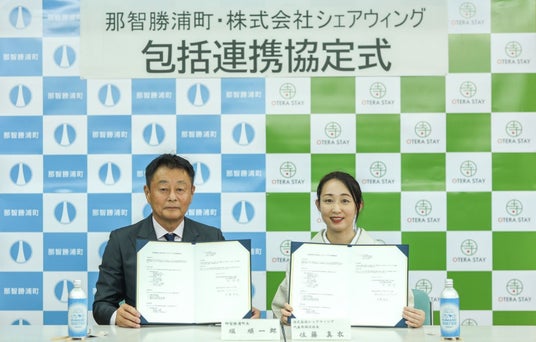寺社に特化した宿泊・体験サービスブランド「OTERA STAY」を展開する株式会社シェアウィング(本社:東京都渋谷区、代表取締役社長:佐藤真衣)は、那智勝浦町と歴史的建造物の活用、訪日外国人誘致、デジタルノマドの誘致を通じて、観光振興および地域の経済発展を図ることを目的とした包括連携協定式を那智勝浦町役場にて開催いたしました。