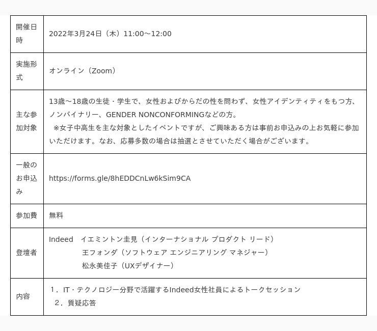 Indeedでは、「We help people get jobs.」をミッションとし、仕事探しにおけるバリアをなくし、あらゆる人々が自分に合った仕事が見つけられる社会の実現を目指しています。本イベントを通じて、IT・テクノロジー分野における女性のキャリアの可能性を示すことで、IT・テクノロジー分野に興味を持つ女子中高生が抱く疑問や不安を解消するとともに、仕事探しにおいて存在しうるバリアを解消する一助になりたいと考えています。