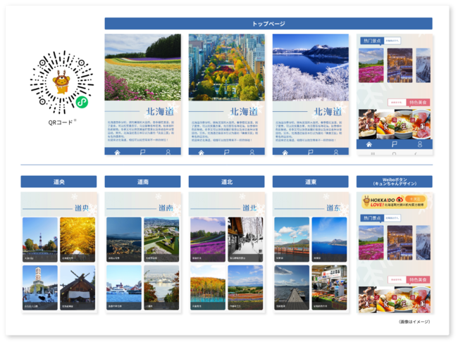 約13億人が日々の生活で利用している中国最大のSNS「WeChat(ウィーチャット)」内に、北海道を道央・道南・道北・道東の4地域に分け、それぞれの自然豊かな観光名所・温泉(大通公園・函館山夜景・富良野・阿寒湖など)やグルメ(ジンギスカン・スープカレーなど)の様々や情報を掲載しました。また、北海道公式ミニプログラムから北海道観光振興機構公式Weiboのミニプログラムにも遷移可能となっており、北海道の最新情報をタイムリーに確認頂けます。雪の結晶のデザインとともに、北海道の魅力をWeChat(ウィーチャット)ユーザーに対してより親しみやすく発信いたします。