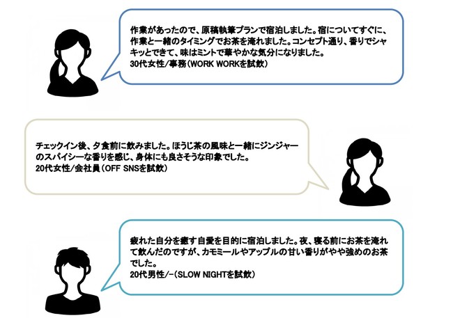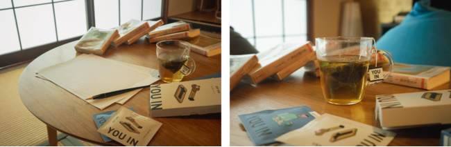 今回「YOU IN」からは、作業の合間の気分転換や寝る前の安らぎの時間に提供できるお茶として、厳選した3種のムードペアリングティーをご用意いたしました。スペアミントとローズマリーの爽快感が口の中に広がり、ワーケーションでの創作や仕事を始める際のスイッチとして飲みたい“WORK WORK”、ほうじ茶ベースで湯河原の時の流れにほっとひと息つきたい時にぴったりな“OFF SNS”、温泉で身体をほぐし、カモミールで心をほぐす、ゆったりと過ごしたい夜に合わせる “SLOW NIGHT”の3種のムードを7月1日より提供しております。また、6月19日までの期間に宿泊されたお客様に試供させていただいたところ、お客様からは「コンセプト通り、まずは香りでシャキッとできました。味はミントで、華やかな気分になります。(WORK WORKを試飲)」や「読書とリフレッシュを兼ねて宿泊し、朝風呂の後に飲みました。甘くておいしかったです。(SLOW NIGHTを試飲)」など、旅館で思いおもいに過ごす宿泊者の時間に寄り添うお茶としてご好評をいただきました。 今回提供させていただく3種のムードは、宿泊されるお客様だけでなく、湯河原の美味しいごはんを日帰りで楽しめる「gensen cafe」のドリンクメニューでもお楽しみいただけます。さらに、旅館のフリースペースにも「YOU IN」の設置を予定しており、お香の香りとともにお茶を楽しめるコラボ企画も予定しております。「The Ryokan Tokyo YUGAWARA」全体で「YOU IN」をお楽しみいただくとともに、親しい友人や家族、恋人と、心置きなく自分の時間を過ごすことができる旅館で、最高にチルでクリエイティブなひと時をお過ごしください。