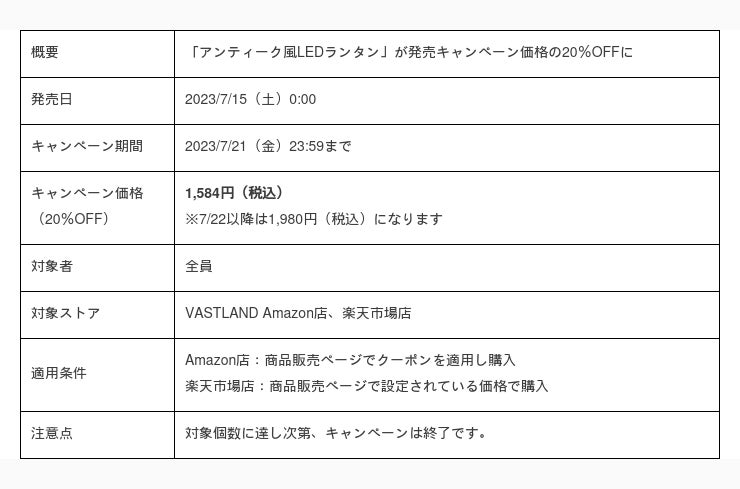 VASTLAND株式会社(本社:兵庫県姫路市/代表:田中悠貴)が運営するキャンプギアブランド「VASTLAND(ヴァストランド)」は、アンティーク感漂う外観に加え、目に優しい灯火のような明かりを再現した「アンティーク風LEDランタン」を2023/7/15(土)にAmazon店&楽天市場店で先行発売することを決定しました。また発売を記念して、Amazon店&楽天市場店限定で20%OFFの価格で購入できる「発売キャンペーン」を開催します。