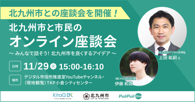 株式会社PoliPoli(所在地:神奈川県鎌倉市、代表取締役:伊藤和真、以下 PoliPoli)は、北九州市による行政に声を届けるウェブサイト「 PoliPoli Gov(β 版)」の利用を受けて、市民と市による座談会の実施と、YouTubeでの座談会のライブ配信を決定したことをお知らせいたします。
