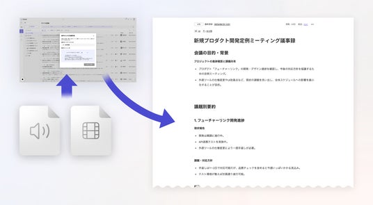 - 音声/動画ファイルをアップロードすることで自動で議事録を生成
