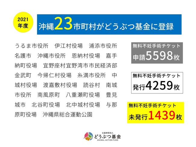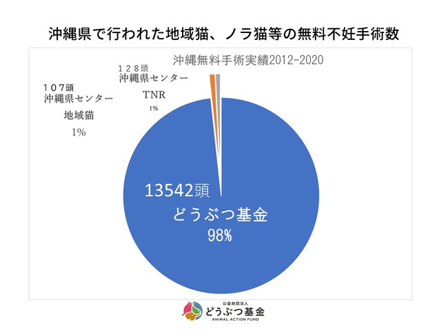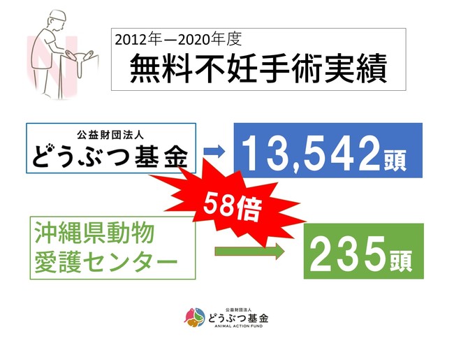 一方、どうぶつ基金が沖縄県下の23市町村と行っているさくらねこ無料不妊手術は2020年度末までに13542頭です。手術数は県センターの58倍になり、沖縄県で行われた地域猫、野良猫の無料不妊手術の98%はどうぶつ基金が行っています。