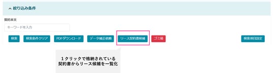 - ワンクリック抽出: 契約書全文検索の画面で「リース契約書候補」ボタンをワンクリックするだけで、新リース会計基準の適用対象候補を自動でリスト化します。