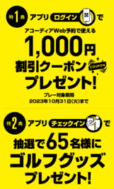 今回の新公式アプリ登場を記念して、新公式アプリをダウンロードかつログインされた方全員を対象に、アコーディアWeb予約で使える1,000円割引クーポンをプレゼントするキャンペーンと、新公式アプリでチェックインされた方の中から抽選でゴルフ用品をプレゼントする2つのキャンペーンを2023年10月31日までの期間限定で実施します。詳しくはキャンペーンサイトをご覧ください。