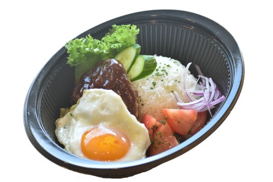 ●ご飯にハンバーグと目玉焼きをのせ、ソースをかけたハワイのローカルフードのこと。