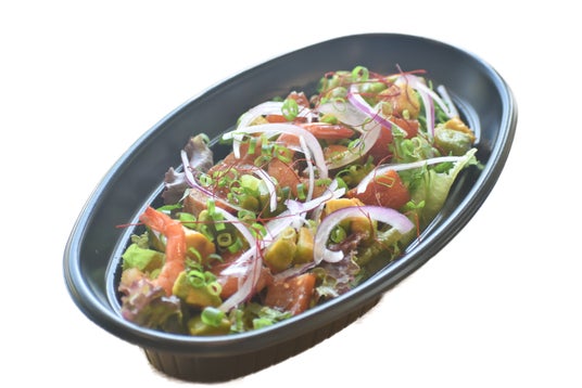 ●絹姫サーモンと幸海老のマリネ、トマト、アボカド、赤オニオン、サラダリーフの下に米を敷いた丼ぶり仕立て