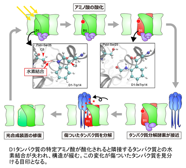 D1タンパク質は光合成装置である光化学系IIのなかで、明反応の中心的な役割を担っており、その反応の結果として活性酸素が生じることがわかっていました。また、一般に活性酸素はタンパク質を酸化させることでダメージを与えることもわかっていました。これらのことから活性酸素の発生場所であるD1タンパク質が真っ先に損傷するのは活性酸素による酸化と推測できます。