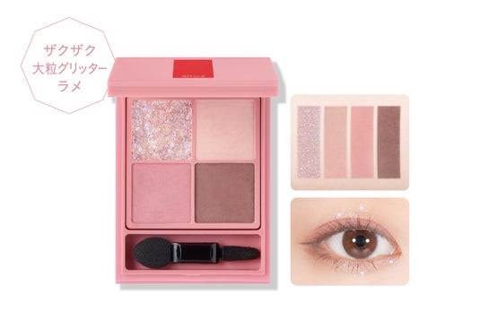 愛らしい目元に仕上がるカラー。しっかりと密着するザクザク大粒のグリッターラメ。