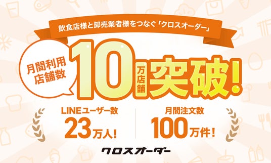 食品流通のDX(デジタルトランスフォーメーション)を推進するクロスマート株式会社(本社:東京都中央区、代表取締役:寺田 佳史、以下「当社」)は、受発注から始まる経営改善プラットフォーム「クロスオーダー」の当月利用店舗数(※)100,000店舗を突破したことをお知らせいたします。LINEでの発注ユーザー数は235,380人を超えています。