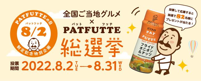 株式会社ピエトロ(本社:福岡市中央区 代表取締役社長:高橋泰行)は、自社商品であるトッピング調味料「PATFUTTE(パットフッテ)」をさらに身近に感じていただけるよう、8月2日を“PATFUTTEの日”(8=“パ”ット、2=“フ”ッテ)と定めました。これを記念して6月より「全国ご当地グルメ×PATFUTTE総選挙」を開催中。8月2日から第1位を決める投票をスタートします。詳細はプレスリリース本文をご確認ください