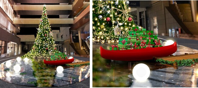 ツリーの根本にはサンタクロースがプレゼントを運ぶ船を表現したフォトスポットがあり、実際に乗り込んで写真を撮り、水辺の国の世界に入り込んだような特別な体験ができます。夜には「光と音の特別演出」を実施し幻想的な「水辺の国」へと誘います。