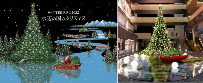 (画像左から)「WINTER RISE 2022 水辺の国のクリスマス」キービジュアルと、クリスマスツリーパース