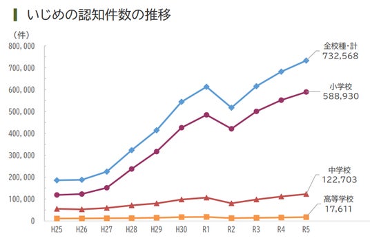 文部科学省の調査によれば、いじめの認知件数は年々増加し、2023年度には小・中・高等学校及び特別支援学校におけるいじめの認知件数は過去最多となる732,568件を記録しています(※1)。