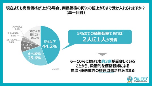 続いて、「現在よりも商品価格が上がる場合、商品価格の何%の値上がりまで受け入れられますか?」という質問に対しては、値上がり自体を「受け入れられない」と回答した人は16.2%であるのに対して、「5%以下」は44.2%、「6~10%」が25.6%と消費者の多くが商品価格の上昇に対して一定の柔軟性を持っていることがわかる結果になりました。こういった結果をもとに物流・運送業界の積極的な待遇改善に期待したいところです。