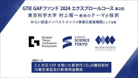 科学技術振興機構(JST)「大学発新産業創出基金スタートアップ・エコシステム共創プログラム」の採択プログラムのGreater Tokyo Innovation Ecosystem(GTIE)「GTIE GAPファンド2024 エクスプロールコース(第2回)」に国立大学法人東京科学大学(理事長:大竹尚登) 総合研究院 ゼロカーボンエネルギー研究所 村上 陽一 教授のテーマ「2.5次元COFを用いた新世代CO2分離回収材の概念実証及び新規用途開拓」が採択されました。株式会社みらい創造インベストメンツ(代表取締役社長:岡田 祐之)は本テーマについて事業化推進機関として伴走し、技術の事業化、スタートアップ創業を目指します。