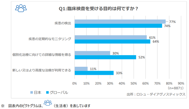 臨床検査を受ける目的について「疾患の検出」を選んだ人の割合が日本を含む10カ国で最も高く、77%(同74%)に上った。日本では「疾患の定期的なモニタリング」と回答した人の割合が61%(同64%)と次に高かった。一方グローバル平均と比べて低かったのは、「個別化治療に向けての詳細な情報を得る」が30%(同52%)、「新しい又はより高度な治療が利用できる」が11%(同33%)などで、大きく差が出た。(図表1)