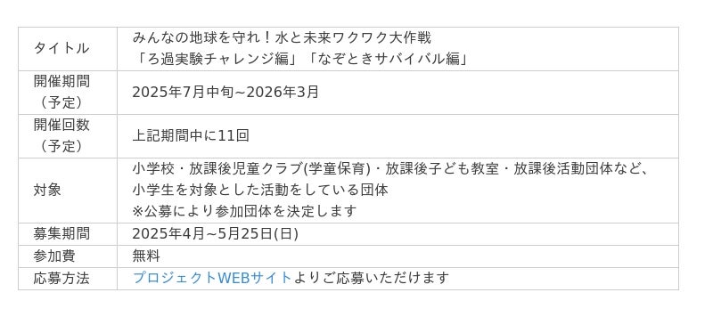 ご好評につき、昨年度に引き続き「ろ過実験チャレンジ編」と「なぞときサバイバル編」2つのプログラムを実施予定です。本イベントの概要や応募方法は以下の通りです。