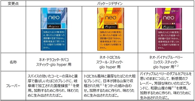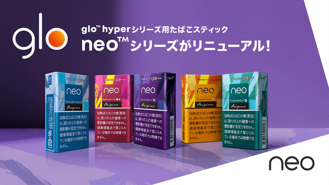 BATジャパン(本社:東京都港区赤坂、社長:エマ・ディーン、正式社名:ブリティッシュ・アメリカン・タバコ・ジャパン合同会社)は、加熱式たばこ専用デバイス「glo(TM) hyper(グロー・ハイパー)」シリーズの専用たばこスティックneo(TM)(ネオ)ブランド5銘柄のパッケージデザイン一新および2銘柄の味わい強化を実施し、5月中旬から7月中旬(※1)にかけて順次切り替わります。またこれまでと変わらない540円(税込)の小売定価にて、全国の主要コンビニエンスストア、たばこ販売店、スーパーマーケット等のたばこ取扱店、glo & VELO オフィシャルオンラインショップの販売チャネルで展開します。