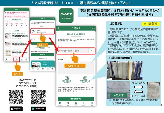こうした現場の御意見を募集しますので、MAFFアプリの「マフちょく」から「リアル行政手続リポートBOX」をお選びいただき、農林水産省の行政手続の申請や審査などでお気づきのことを教えてください。