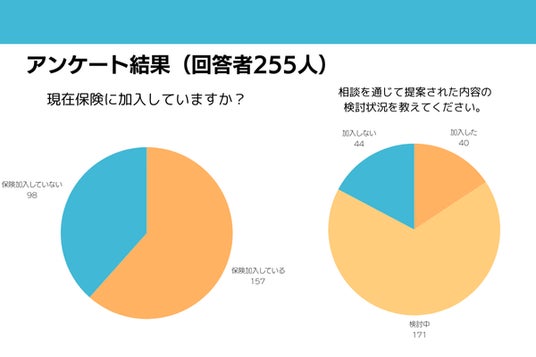 アンケートの回答があった255名のうち、157名が既に保険に加入しており、98名は保険に加入していないとの結果でした。(グラフ:左)