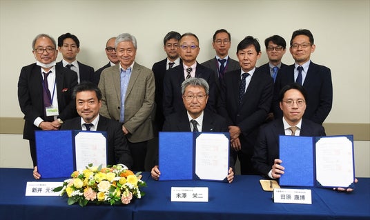 戦略的覚書調印の様子(左:Synspective社 新井元行代表取締役CEO 右:地圏環境テクノロジー社 田原康博代表取締役社長 中央:OCG社 代表取締役社長 米澤栄二)