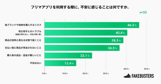 フリマアプリを利用する際に不安に感じることを尋ねたところ、「偽ブランドや偽物を購入するリスク」が46.2%で最も多く、「取引相手とのトラブル(連絡が取れない、対応が悪い等)」が40.4%、「商品が説明と異なる状態で届くこと」が38.5%と続きました(n=52/フリマアプリ未経験で利用意向がある方)。