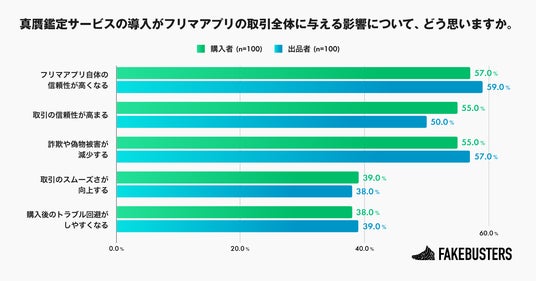 鑑定サービスの導入がフリマアプリの取引に与える影響について尋ねたところ、購入者と販売者ともに、「フリマアプリ自体の信頼性が高くなる」との回答が最多となりました(n=200)。