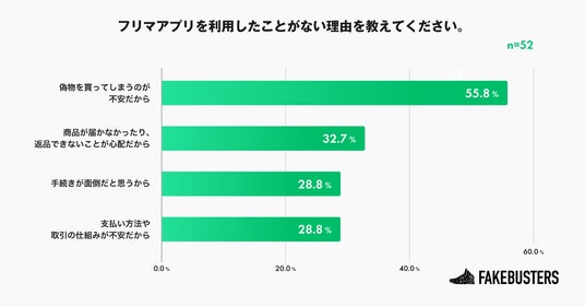 フリマアプリを利用したことがない理由を尋ねたところ、「偽物を買ってしまうのが不安だから」が55.8%で最多となりました(n=52/フリマアプリ未経験で利用意向がある方)。