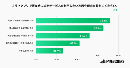 フリマアプリで販売時に鑑定サービスを利用したい理由を尋ねたところ、「商品のすり替え詐欺を防ぐため」が71.6%で最多となり、「購入後のトラブルを防ぐため」が65.4%と続きました(n=81/鑑定サービスの利用意向がある方)。