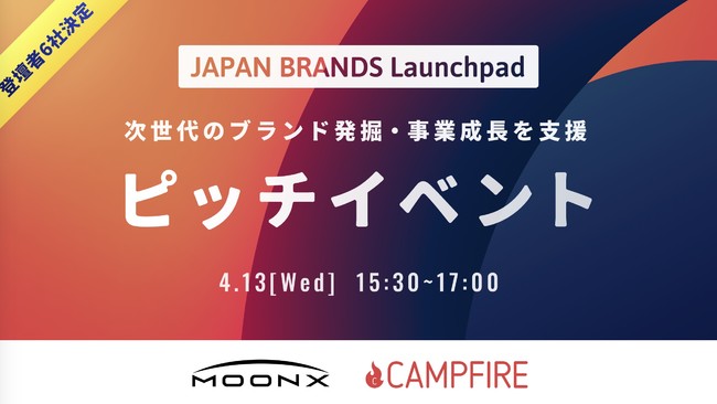 「JAPAN BRANDSの発射台となる」MOON-X株式会社(代表:長谷川 晋、以下:MOON-X)は、国内最大*のクラウドファンディング「CAMPFIRE」を運営する株式会社CAMPFIRE(代表:家入 一真、以下:CAMPFIRE)と共催ピッチイベント『JAPAN BRANDS Launchpad』を4月13日(水)に開催いたします。本イベントでは、スタートアップ企業や経営者がブランドのアイディアをピッチし受賞したブランドは、MOON-XとCAMPFIRE両社および今回の審査員企業であるソウルドアウトによるクラウドファンディングの立ち上げからブランドの拡販・ブランディングから事業拡大まで一気通貫した支援を受けることができます。