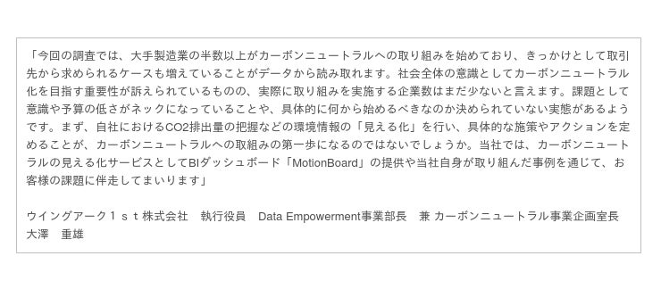 ウイングアーク1st株式会社(本社:東京都港区、代表取締役 社長執行役員CEO:田中 潤、以下、ウイングアーク1st)は、製造業かつ売上30億円以上の企画および現場の責任者である、ライン責任者303名を対象に、製造業の「カーボンニュートラルの実態調査」を実施しましたのでお知らせします。