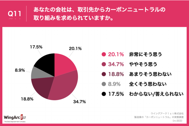 「Q11.あなたの会社は、取引先からカーボンニュートラルの取り組みを求められていますか。」(n=303)と質問したところ、「非常にそう思う」が20.1%、「ややそう思う」が34.7%という回答となりました。