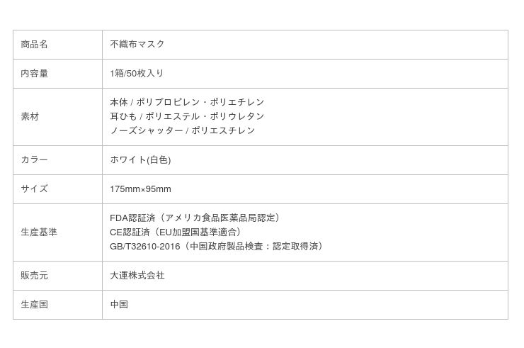 大運 株式会社(本社所在地:埼玉県川口市 代表取締役:王 景国)は、高品質不織布マスクを安価でより多くの方にご使用いただくため、中国支社が中国政府認定・FDA CE認定取得の大手工場と連携し生産面での品質管理を徹底しております。また、輸入手続き、通関作業、荷物の搬入、出荷作業、全て自社で行い低価格での販売を実現させることが出来き、業界最安値水準の1箱(50枚入)390円で12月18日より販売を開始致します。各国の品質基準をクリアし、証明書を取得した工場で品質・衛生管理を徹底しているため、安全にご利用いただけます。また、薬局・医療機関・企業に大量納品の実績がありますので、安心してご利用いただけます。コロナ渦のなか、経済活動との両立に少しでも貢献できましたら、嬉しく思います。