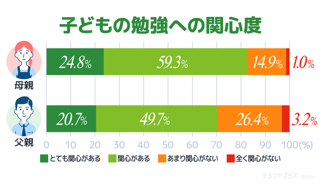 子どもの勉強について「とても関心がある」と答えた割合は母親24.8%、父親20.7%とあまり大きな差はありませんでした。全体では母親は約8割、父親は約7割が「とても関心がある」「関心がある」と答えており、母親の方がやや高いとは言え、父親も子どもの勉強に対して高い関心を寄せていることがわかりました。