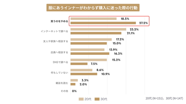夏、服を購入する際にあわせるインナーがわからず、約半数の人が「迷うことがある」と購入を迷うことがあるという結果となりました。さらに、迷った際の行動については、20代は「インターネットで調べる」が最多、続いて「買うのをやめる」と回答した一方で、30代は、迷った際は「買うのをやめる」が最多、次に「インターネットで調べる」という回答となりました。